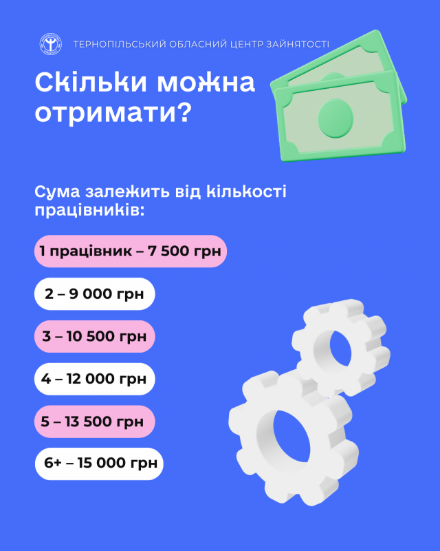 Розмір допомоги становить від 7 500 до 15 000 гривень і залежить від кількості найманих працівників. Так, за одного працівника передбачено 7 500 гривень, за двох – 9 000 гривень, за трьох – 10 500 гривень, за чотирьох – 12 000 гривень, за п’ятьох – 13 500 гривень, а за шістьох і більше – максимальну суму у 15 000 гривень.